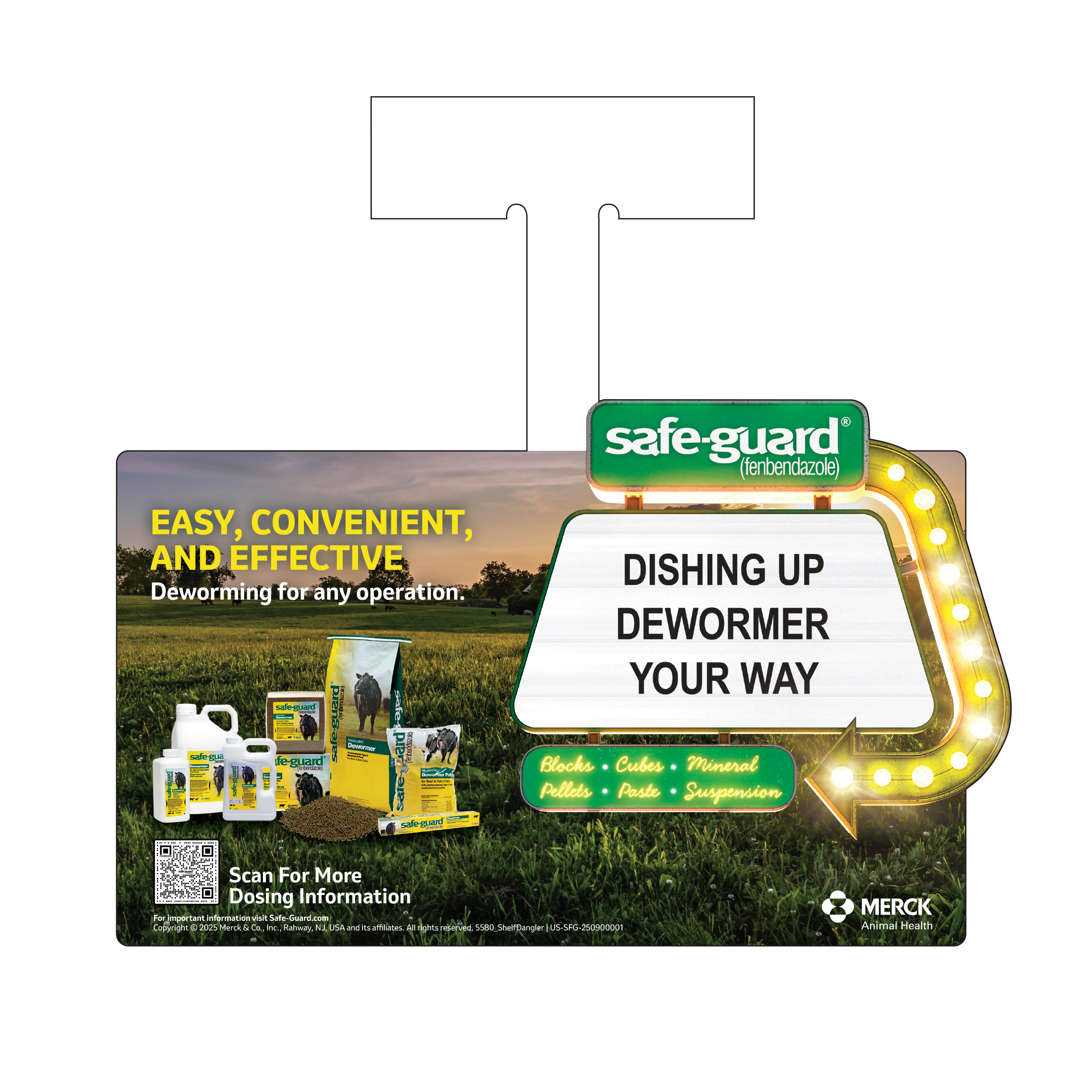 Draw your customer’s attention with this 9.5” x 9” shelf dangler. It promotes the SAFE-GUARD® line of Dewormers and the easy, convenient and effective deworming options.