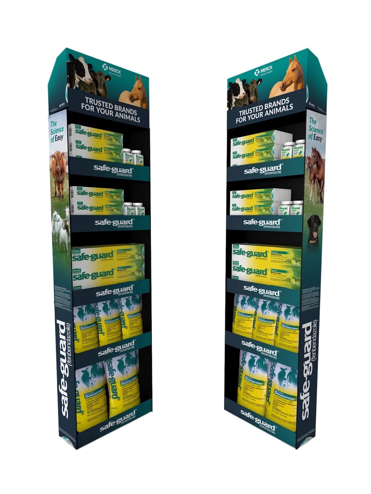 Merck Animal Health promotes Trusted Brands for Your Animals. Put them all together, and we’ll supply smart, eye-catching merchandising to capture customer attention and fill their basket. This Power Wing creates new shelf space that can be featured in any store and moved with ease. Easily affixes to most aisle shelving. The Power Wing is 14.5″ wide x 5″ deep x 56″ tall. The quantities for the Power Wing are: 12 SAFE-GUARD® 25gm paste, 8 SAFE-GUARD® 125mL Goat Dewormer, 3 SAFE-GUARD® 92gm paste, 6 SAFE-GUARD® 1lb pellets, and 2 SAFE-GUARD® 5lb pellets. You could also replace both of the pellets with 4 ULTRA BOSS®Qt and 4 ULTRA SABER™ 900mL.
